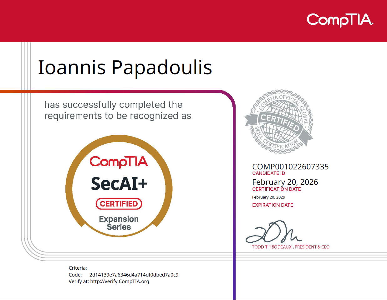 I am an Offensive Security Professional with a strong technical background, passionate about breaking and securing systems. I hold CompTIA Security+, CompTIA PenTest+, SecAI+ and CNVP (CompTIA Network Vulnerability Assessment Professional), and I am currently pursuing OSCP to deepen my offensive security expertise. I actively sharpen my skills through CTFs and labs on Hack The Box. Fluent in English, French, Spanish, Greek, and Polish, I enjoy connecting with people from diverse cultures and backgrounds. Outside of work, I stay active by lifting, keeping up with technology, reading, and constantly improving through hands-on learning.