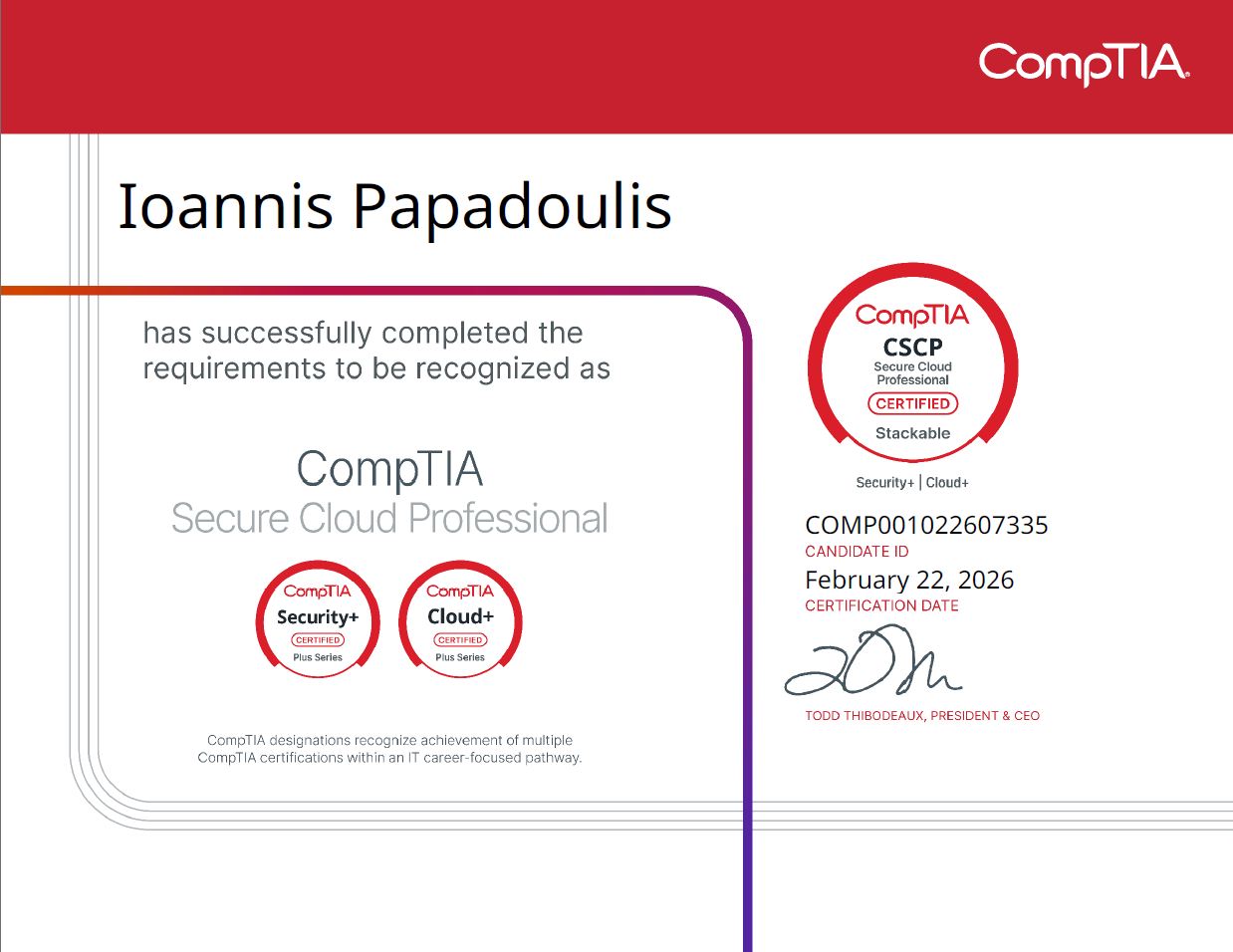 I am an Offensive Security Professional with a strong technical background, passionate about testing and securing systems. I hold CompTIA Security+, CompTIA PenTest+, CompTIA Cloud+, CompTIA SecAI+, CNVP (CompTIA Network Vulnerability Assessment Professional), and CompTIA Secure Cloud Professional (CSCP), and I am currently preparing for the OSCP and BSCP to deepen my offensive and web application security expertise. I actively sharpen my skills through CTFs and labs on Hack The Box. Fluent in English, French, Spanish, Greek, and Polish, I enjoy connecting with people from diverse cultures and backgrounds. Outside of work, I stay active by lifting, keeping up with technology, reading, and constantly improving through hands on learning.